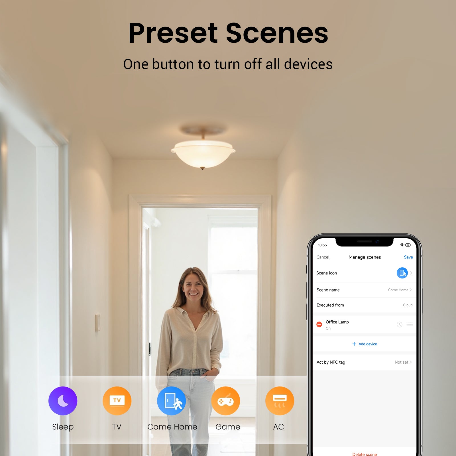 【Smart Scenes, Schedules & Automation】Build one-tap scenes for daily routines—like Movie Night to power on your TV, DVD, and speakers in sync. Set up Leave Home mode to turn off all appliances with one tap. Schedule timers to auto-start or shut off your devices at specific times, optimizing comfort and saving energy.