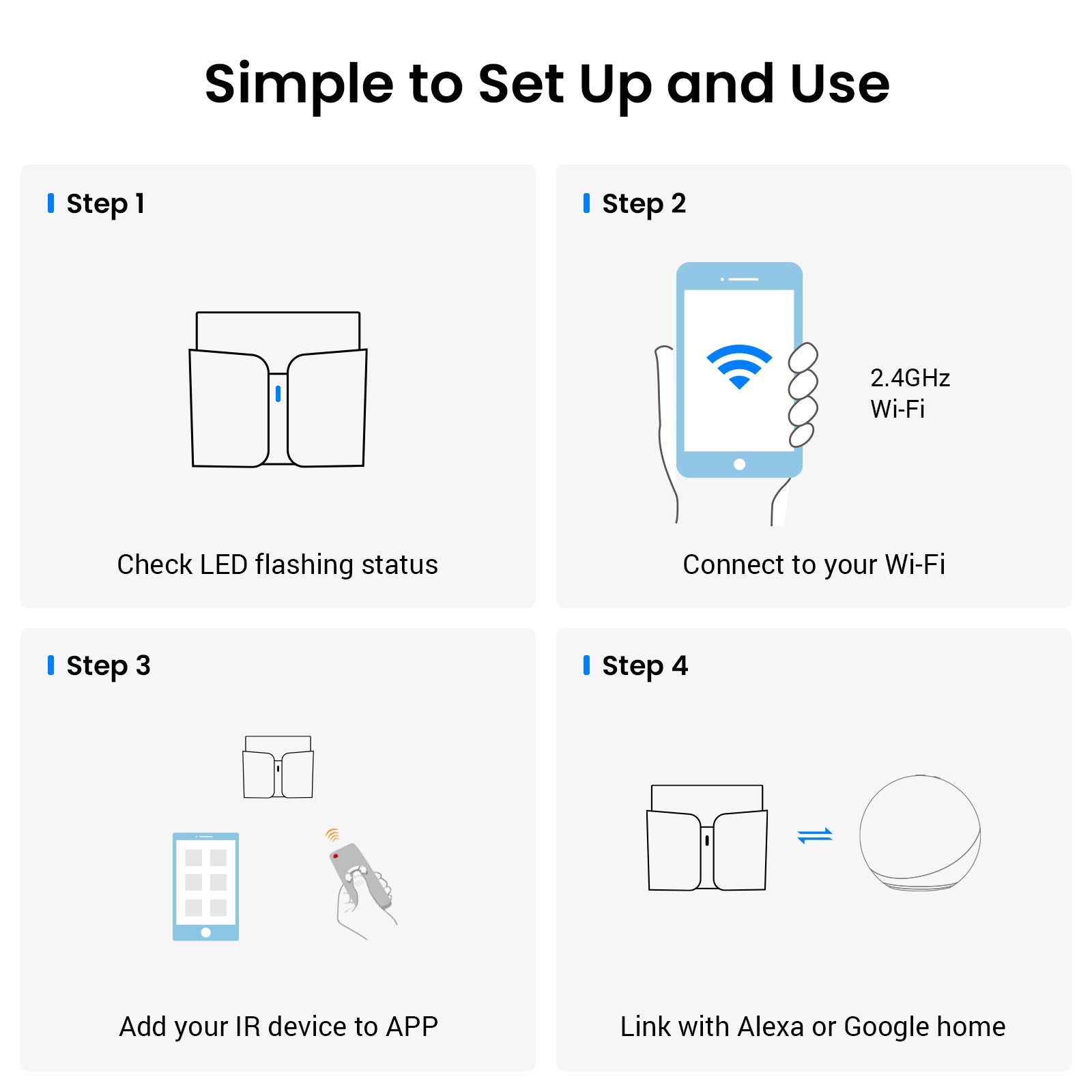 With Wi-Fi control, you can manage all your infrared appliances from anywhere using the Broadlink app. Turn on the AC before you get home or power off devices remotely for peace of mind and energy savings.